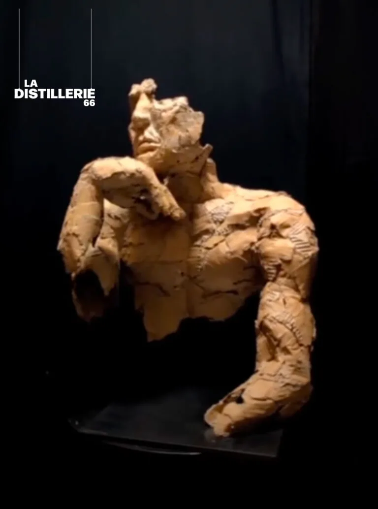 Carton, bois, métal, résine — chaque matériau est choisi pour ce qu’il raconte. Le carton, omniprésent et recyclable, occupe une place centrale : léger, malléable, vivant, il permet de capter les plis, les failles et les vibrations du corps. À travers lui, l’artiste sculpte des formes à la fois délicates et puissantes.