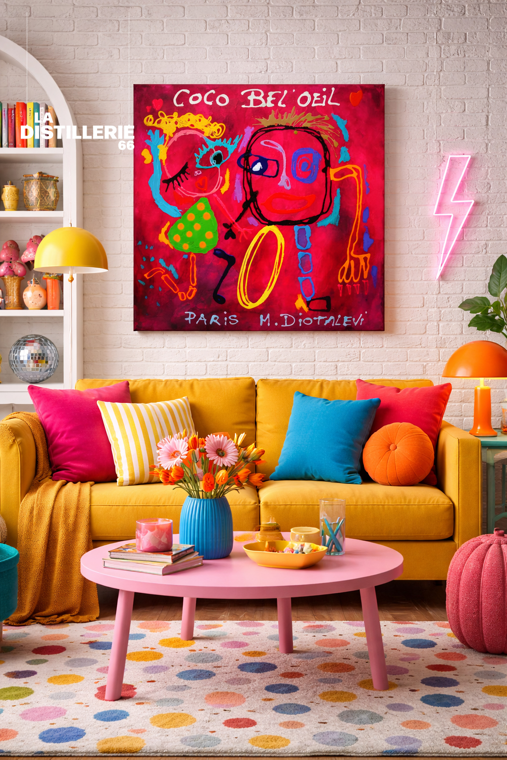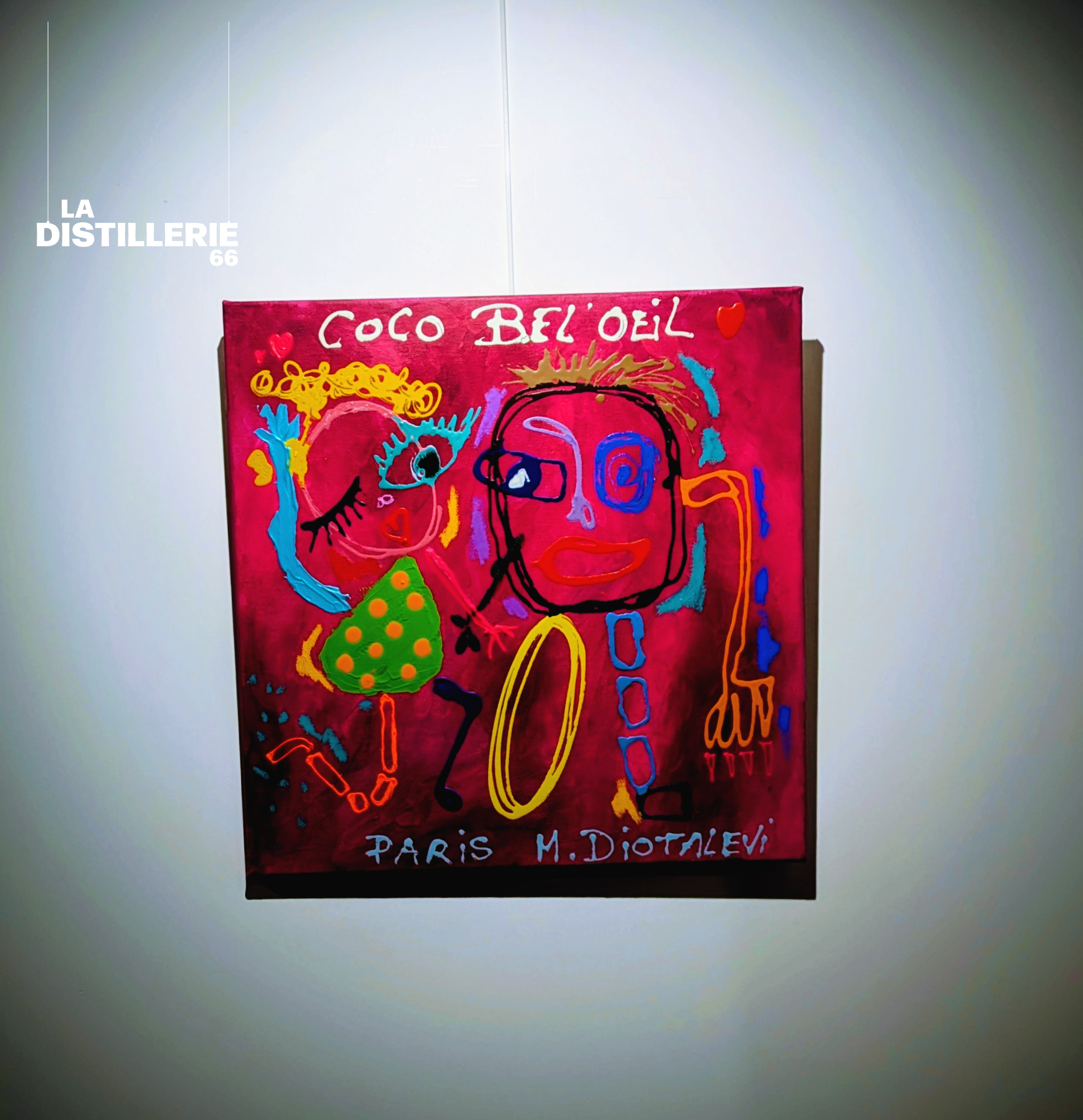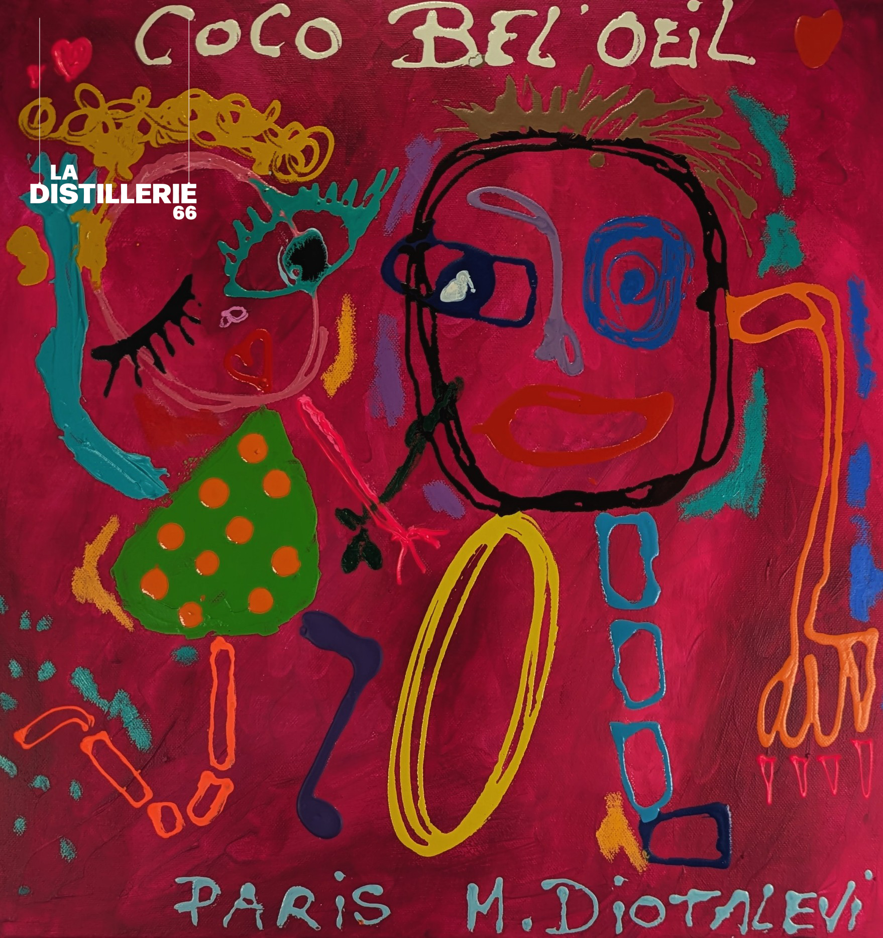 Coco Bel Oeil s’inscrit dans l’univers pictural de Martine Diotalevi, où la figure devient un terrain d’expression libre, instinctif et relationnel.